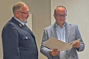 Darüber hinaus sprach Kommandant Eckerlein weitere Ehrungen aus: Jens Vedder wurde für 30 Jahre aktiven Dienst ausgezeichnet, Anna-Maria Burzler, Maleen Lampmann und Till Leinweber für jeweils 10 Jahre Engagement im aktiven Feuerwehrdienst.