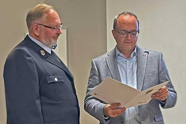 Darüber hinaus sprach Kommandant Eckerlein weitere Ehrungen aus: Jens Vedder wurde für 30 Jahre aktiven Dienst ausgezeichnet, Anna-Maria Burzler, Maleen Lampmann und Till Leinweber für jeweils 10 Jahre Engagement im aktiven Feuerwehrdienst.